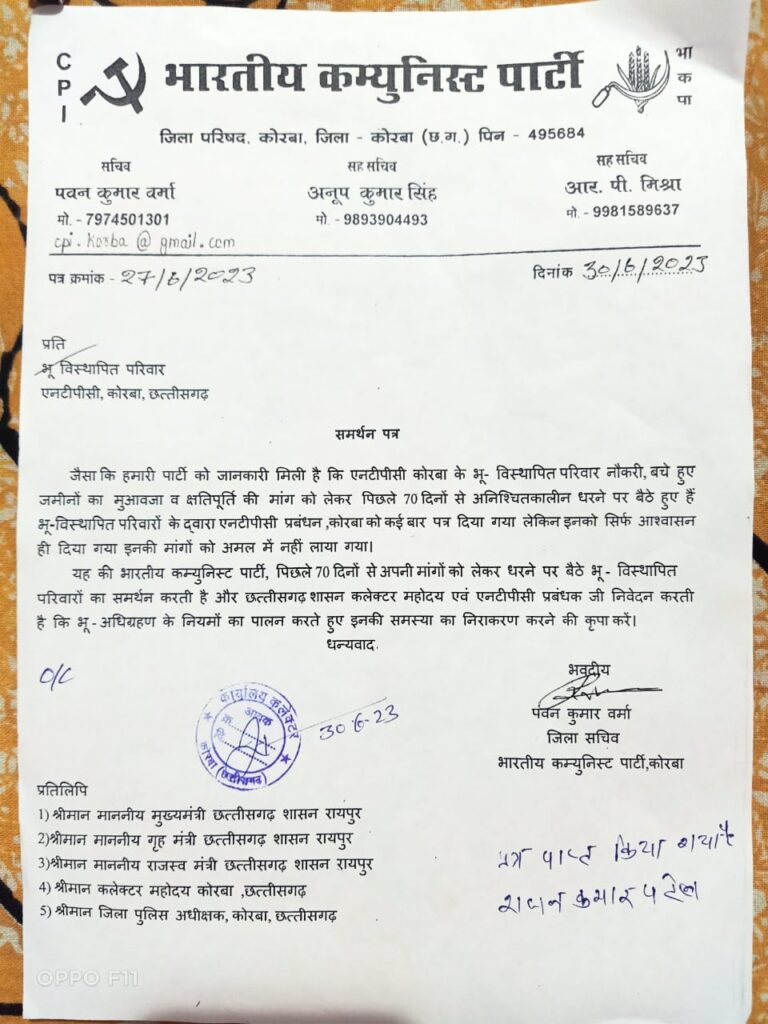 भारतीय कम्युनिस्ट पार्टी कोरबा ने भुविस्थपित परिवारों के अनिश्चित कालीन धरना का समर्थन किया है।