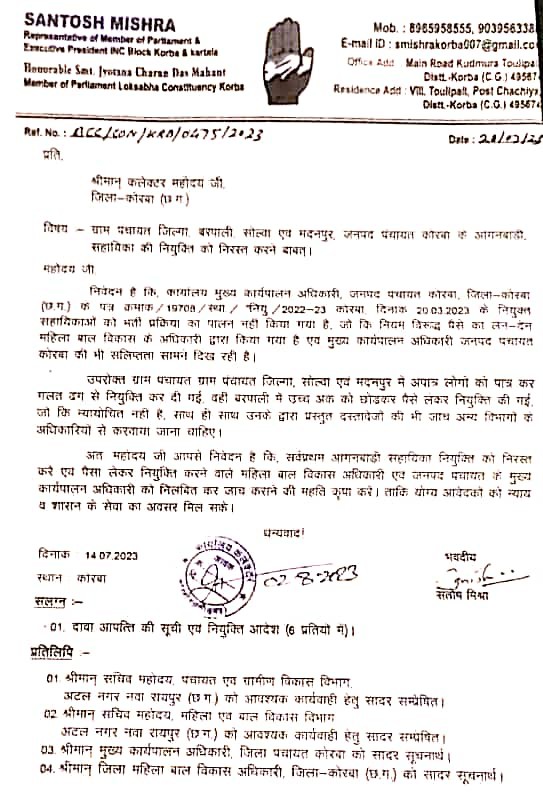 प्रखर राष्ट्रवाद न्यूज़। एक कहावत मशहूर है खाने वाले को खाने का बहाना चाहिए। दरअसल बात विगत 2019-20 के आंगनबाड़ी कार्यकर्ता और सहायिका भर्ती के गलत तरीके से नियुक्ति की है। जिसमें काफी सेक्टरों से सहायिकाओं और कार्यकर्ता की भर्ती उसके नियमावली अनुसार था या यूं कहें जिसका 8वीं, 10वीं 12वीं के अंकसूची में अधिकतम अंक वाले और मांगे गए सभी पात्र कागजात उपलब्ध अभ्यर्थियों को पात्रता दी गई थी। जिसमें जिल्गा, बरपाली, सोलवां और मदनपुर में महिला बाल विकास अधिकारी और मुख्य कार्यपालन अधिकारी कोरबा (CEO) ने अपने स्वार्थ का स्वांग रचाकर उन पात्र अभ्यर्थियों को अपात्र कर, अपात्र अभ्यर्थियों को लिया गया जिन्होंने महिला बाल विकास अधिकारी को मोटी रकम दी है। इस लेन देन की पूरी घटना क्रम के बारे में पूर्व सीईओ को जानकारी थी जिसके कारण उनके नियुक्ति पत्र पर उन्होंने अपनी हस्ताक्षर नहीं किए। और जैसे ही नए सीईओ ने पद भार संभाला और महिला बाल विकास अधिकारी ने उसे अपने भ्रष्टाचार में शामिल कर नियुक्ति पत्र पर हस्ताक्षर भी करवा लिए, जिसे देख और जिसकी जानकारी कोरबा जिला के सांसद ज्योत्सना चरणदास महंत के प्रतिनिधि संतोष मिश्रा (अधिवक्ता सत्र न्यायालय कोरबा) को मिली। जिसे तत्काल संज्ञान में लेते हुए सांसद प्रतिनिधि संतोष मिश्रा ने जिला कलेक्टर से लिखित शिकायत पत्र दिया है। जोकि पूर्णतया सत्य है। गौरतलब है कि अगर छोटे मोटे अधिकारियों का ये हाल रहा तो भ्रष्टाचार की तूती बोलने लगेगी जिसे अंकुश लगाना अति आवश्यक हो गया है। सांसद प्रतिनिधि संतोष मिश्रा ने कलेक्टर से शिकायत में कहा कि जिस भी सेक्टर में यह खेल खेला गया उसे निरस्त किया जाए, तदोपरांत जांचकर दोष सिद्ध हो जाने पर दोषी के ऊपर कड़ी कार्यवाही किया जाए। और वहां के स्थानीय लोग भी यही कह रहे हैं कि दोषी को सजा और जिस पद की गरिमा को धूमिल किया जा रहा है, उसे इस पद से पदच्युत किया जावे। सोचने वाली बात है आखिर इतने अभय कैसे हो जाते हैं भ्रष्टाचारी अधिकारी? आखिर कौन देता है संरक्षण? क्या इसमें और भी अधिकारी भी हैं शामिल? महिला बाल विकास अधिकारी ने और भी सेक्टरों से मोटी रकम वसूली है जिसका पता साजी कुछ खूफिया पत्रकारों द्वारा पता साजी किया जा रहा है? सबूत मिलते ही रकम वसूली के भ्रष्टाचारियों को बेनकाब भी किया जाएगा।
