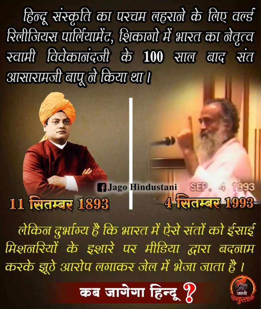 🚩हिन्दू संस्कृति का परचम लहराने वर्ल्ड रिलीजियस पार्लियामेंट (विश्व धर्मपरिषद) शिकागो में भारत का नेतृत्व 11 सितम्बर 1893 में स्वामी विवेकानंदजी ने और ठीक उसके 100 साल बाद 4 सितम्बर 1993 में हिंदू संत आशारामजी बापू ने किया था ।