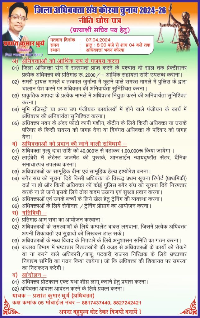 प्रशांत कुमार धुर्य कोरबा जिला अधिवक्ता संघ के सम्माननीय सदस्य के साथ साथ मृदुभाषी,तेज तर्रार, व संघ हित लिए सदैव अग्रणी रहने वाले व्यक्ति हैं। अधिवक्ता प्रशांत कुमार धुर्य ने कहा कोरबा जिले के समस्त अधिवक्ता साथी मेरे लिए आदरणीय और वरिष्ठ हैं,उनसे मेरा आग्रह है कि मुझे मत प्रदान कर सेवा करने का सौभाग्य प्रदान करें, उन्होंने आगे कहा कि कोरबा बार छत्तीसगढ़ का नंबर 1 बार संघ हो,पूरे छत्तीसगढ़ के बार संघ को एकजुट कर अधिवक्ताओ के समस्त हित के लिए अधिवक्ता प्रोटेक्शन एक्ट छत्तीसगढ़ में लागू कराएंगे एवं 2 वर्ष तक नियमित रूप से प्रतिमाह जूनियर अधिवक्ता साथियों को 2000 रुपए कोरबा बार संघ के माध्यम से प्रदान करने का कार्य करेंगे।