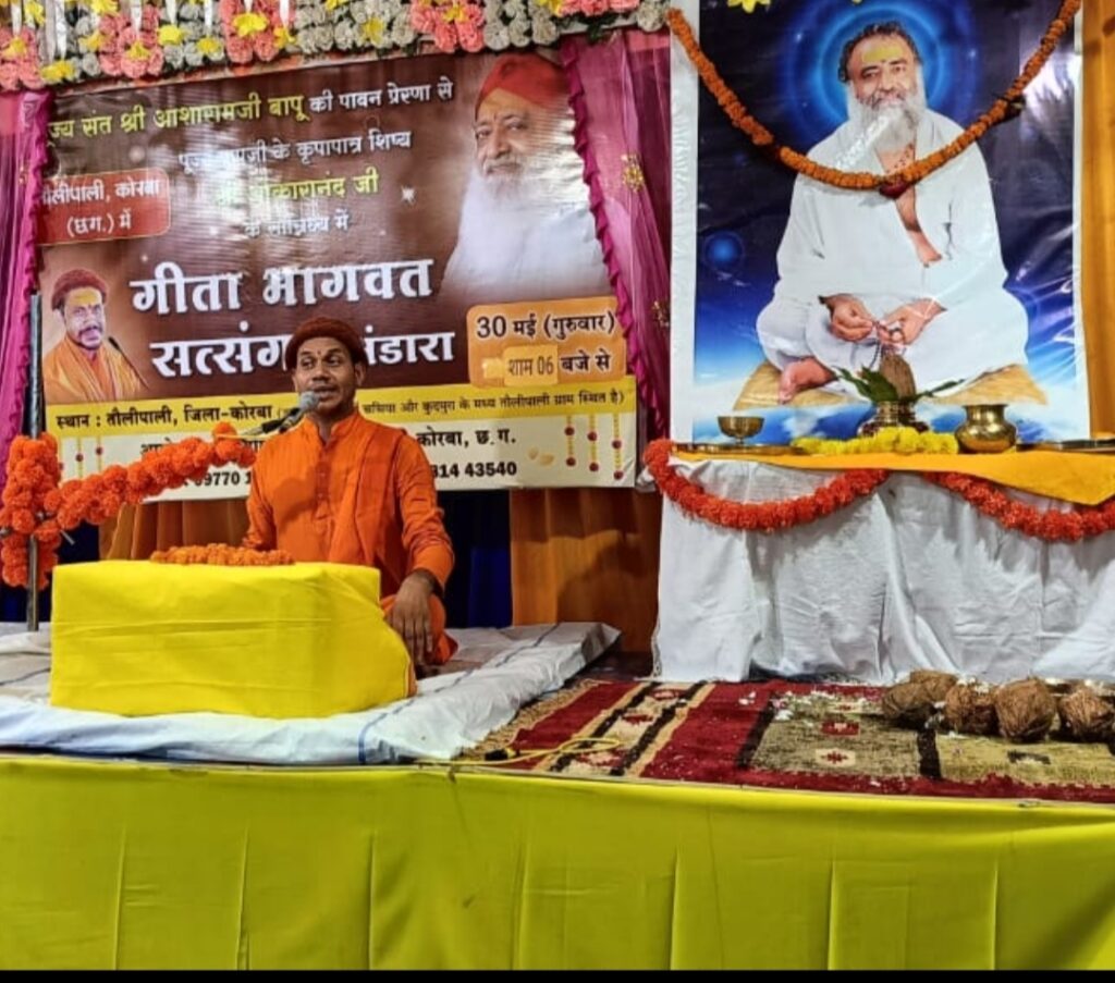 प्रखर राष्ट्रवाद न्यूज छत्तीसगढ़/कोरबा – छत्तीसगढ़ के कोरबा जिले के दूरस्थ क्षेत्र के ग्राम तौलीपाली में संत श्री आशारामजी बापू की प्रेरणा से उनके कृपा पात्र शिष्य ओमकारा नंद के सानिध्य में एक दिवसीय भव्य भंडारा एवं गीता भागवत सत्संग का समापन हुआ।संत श्री आशारामजी बापू की पावन प्रेरणा से पूरे भारत वर्ष के सभी जिला मुख्यालयों एवं उनके अन्य कई क्षेत्रों में भव्य भंडारा,गीता भागवत सत्संग,कई तरह के सेवा कार्य,विद्यार्थियों के लिए राष्ट्र निर्माण शिविर आयोजित किये जाते हैं,30 मई को शाम 6 बजे से देर रात्रि तक तौलीपाली में भंडारा और सत्संग हुआ सैंकड़ो की संख्या में माता, बहन,भाई,युवा वर्ग,बुजुर्ग,वरिष्ठ नागरिक भंडारा एवं सत्संग कार्यक्रम में शामिल हुए।