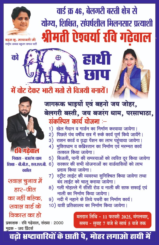 वार्ड क्रमांक 46 बेलगरी बस्ती से बहुजन समाज पार्टी के पार्षद प्रत्याशी ऐश्वर्या रवि गढ़ेवाल ने कहा कि मै पार्षद नहीं जनता की सेविका बनकर वार्ड का संपूर्ण विकास करूंगी,मै जीतकर आऊंगी तो वार्ड के विकाश के नाम पर मिले राशि को गबन करने वालों के मुंह में ताला लगाकर वार्ड कि तमाम मूलभूत सुविधाओं को प्रत्येक वार्डवासियों को मुहैया कराउंगी। पार्षद प्रत्याशी ऐश्वर्या रवि गढ़ेवाल ने वार्ड क्रमांक 46 बेलगरी बस्ती की समस्त मतदाताओं से विनम्र भाव से अपील करते हुए कहा कि प्रत्येक दृष्टिकोण से वार्ड के संपूर्ण विकास के लिए मुझे हाथी छाप पर मतदान कर पार्षद के रूप में मुझे अपनी सेविका चुने।