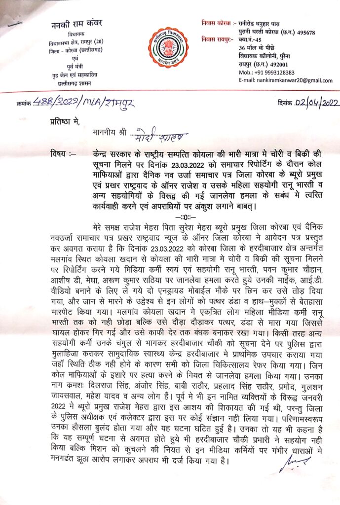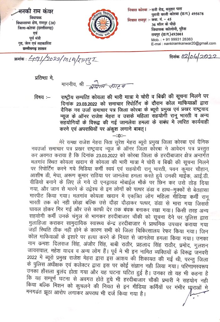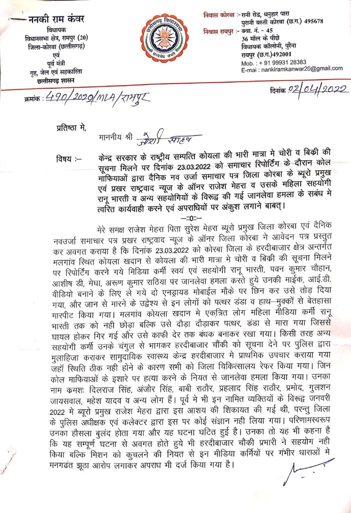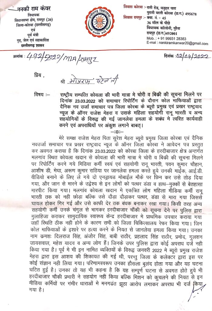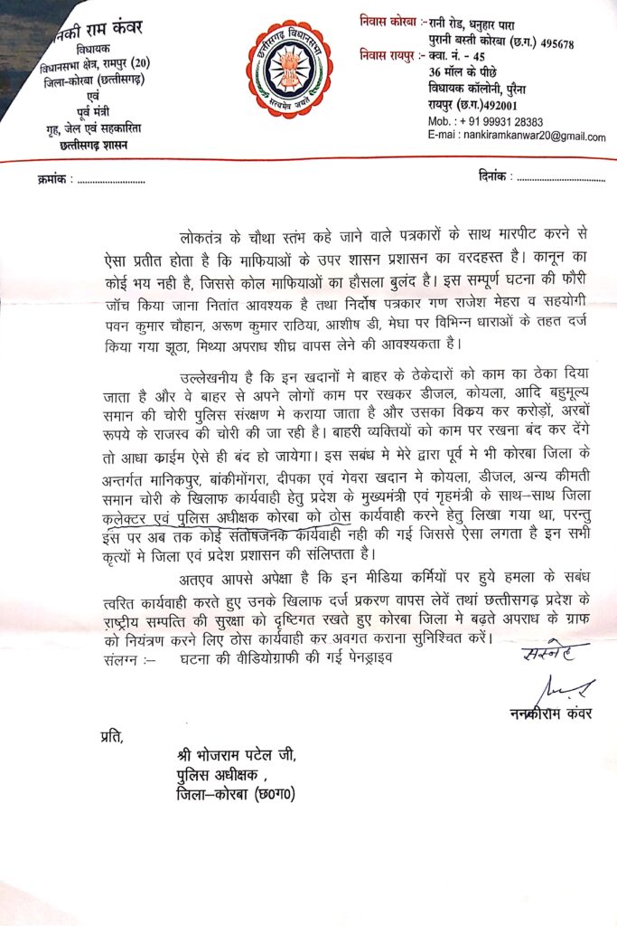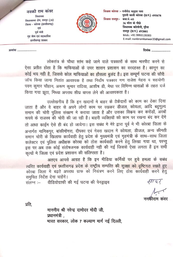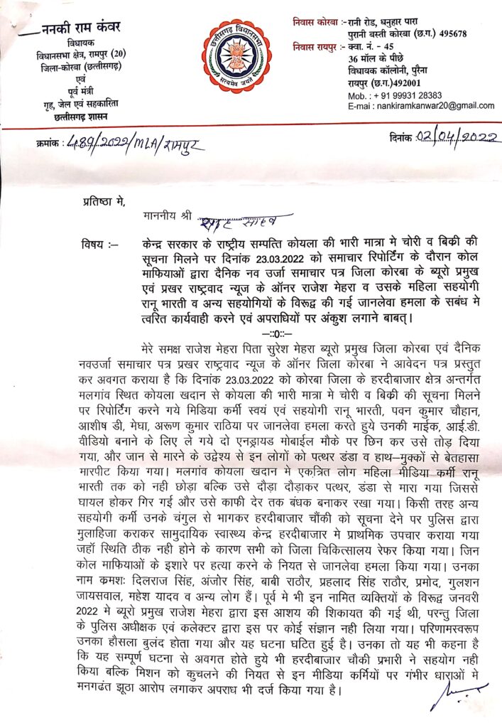 प्रदेश के दिग्गज नेता पूर्व गृहमंत्री व रामपुर विधानसभा के विधायक ननकीराम कंवर को अपनी व्यथा सुनाई। जहां रामपुर विधायक ने लोकतंत्र के चौथे स्तंभ कहे जाने वाले पत्रकारों पर साजिश कर किए गए जानलेवा हमला के संबंध में त्वरित संज्ञान लेते हुए देश के प्रधानमंत्री,केंद्रीय गृहमंत्री,केंद्रीय कोयलामंत्री ,प्रदेश मुखिया सी एम भूपेश बघेल व कोरबा पुलिस अधीक्षक भोजराम पटेल को पत्र लिखा।