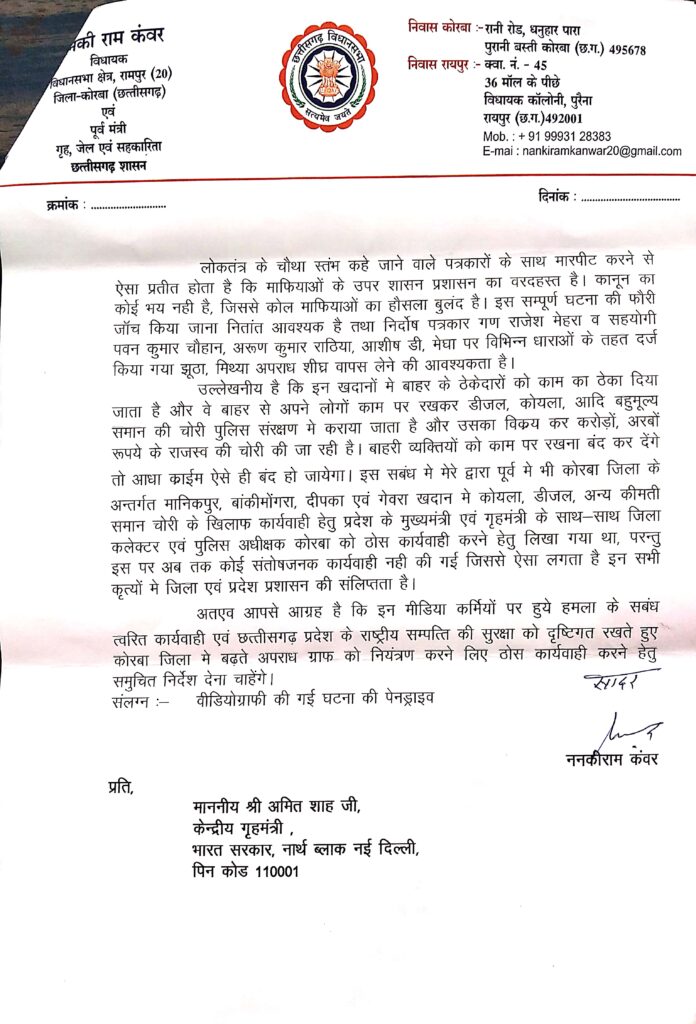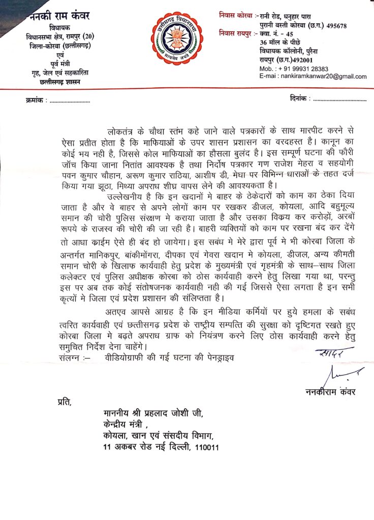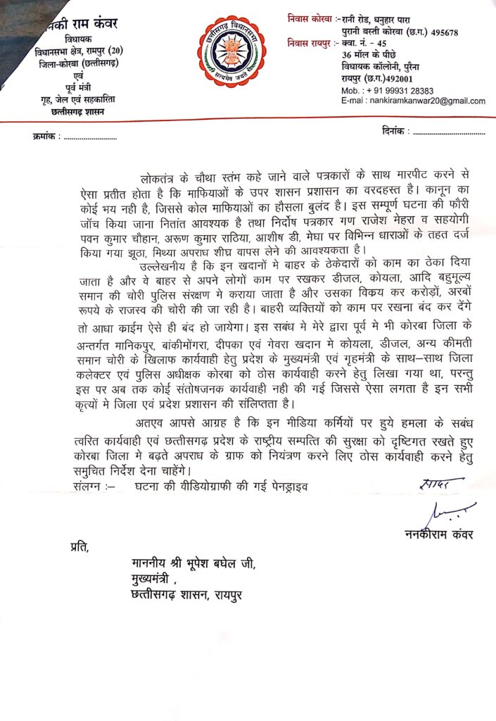 श्री कंवर ने देश के प्रधानमंत्री,केंद्रीय गृहमंत्री,केंद्रीय कोयला मंत्री, प्रदेश के मुख्यमंत्री,कोरबा पुलिस कप्तान को लिखे पत्र में यह उल्लेख किए हैं